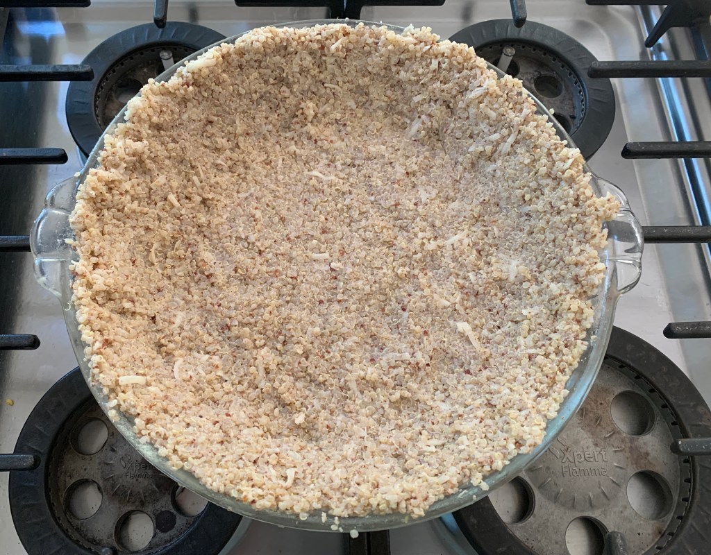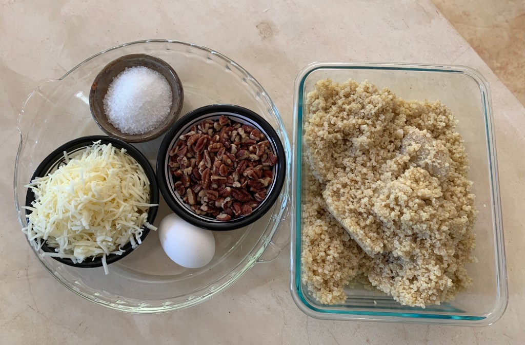 - Prepare the crust first. Mix the cooked quinoa (best if cooked in a broth for added flavor) with finely chopped pecans (I chop mine in a mini-Cuisinart until they are almost like flour), grated cheese, egg, and salt, and mix everything with your hands until well combined and starting to stick together.