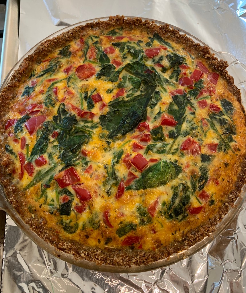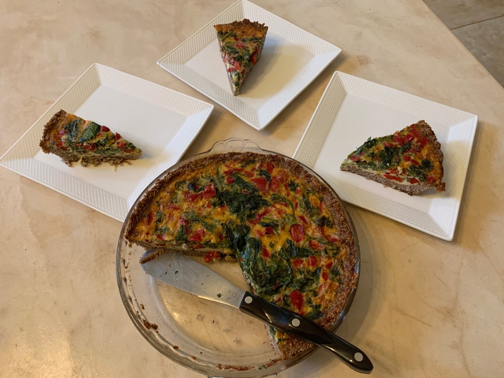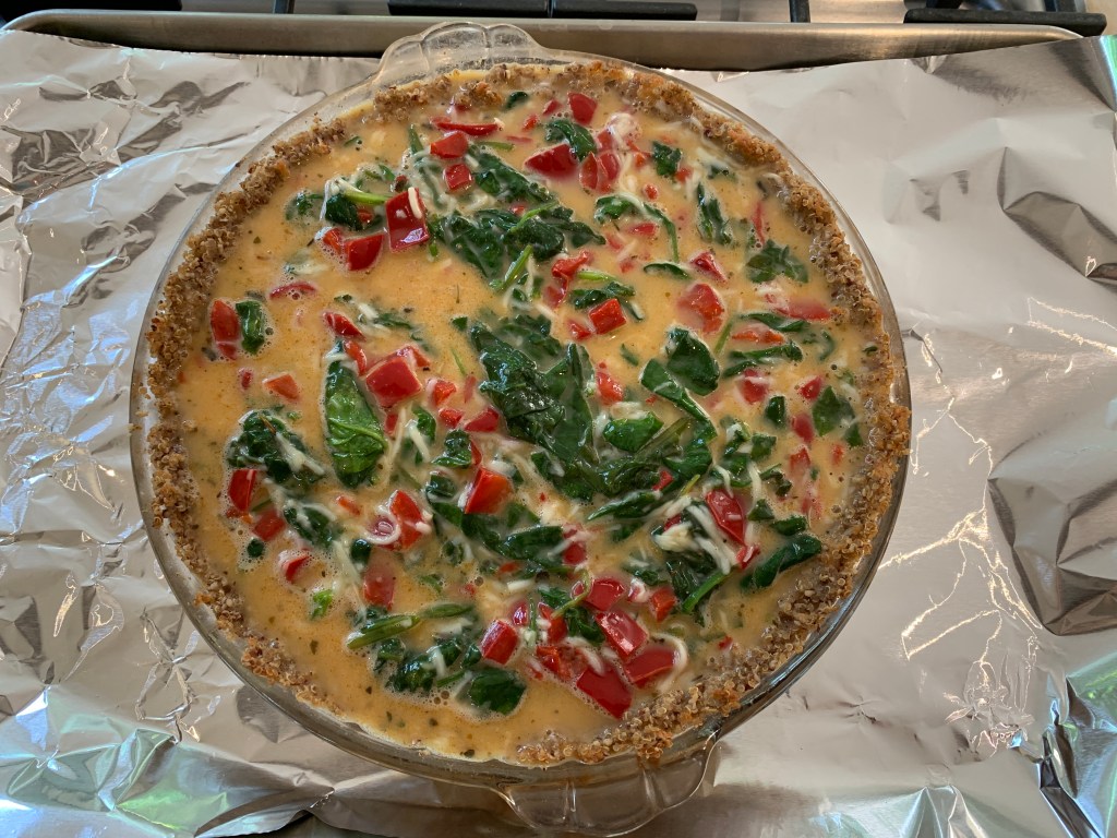 I woke up the other morning thinking about what was in my fridge and what I could make with it for meals this week. I hate wasting food, and I had some leftover cooked quinoa that no one was eating taking up space on the bottom shelf. I’m quite certain I’m the only one in my household that even knew it was there or worried about its fate. But I was determined not to throw it away. As I laid in bed, the idea of turning it into a crust for quiche felt like a stroke of brilliance. Or madness. Am I the only one that wakes up thinking about what’s in the fridge, worried over the fate of leftovers and inventing recipes? Please tell me that I’m not alone. Is it a sign that I have an unhealthy obsession with food, that I’m losing my mind, or that cooking is my calling? I’m not sure, but the quinoa crust quiche turned out delicious, so I want to share the recipe with you. Nut flour and cheese hold this crust together, making it really savory and satisfying – plus it’s gluten-free! I used a veggie filling, but you can put whatever you like in it. Let me know if you try it and add your suggestions for improvements in the comments below. Provecho!