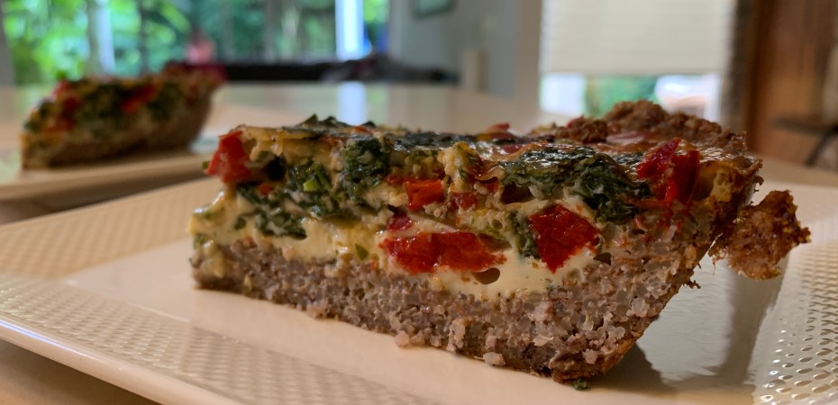 I woke up the other morning thinking about what was in my fridge and what I could make with it for meals this week. I hate wasting food, and I had some leftover cooked quinoa that no one was eating taking up space on the bottom shelf. I’m quite certain I’m the only one in my household that even knew it was there or worried about its fate. But I was determined not to throw it away. As I laid in bed, the idea of turning it into a crust for quiche felt like a stroke of brilliance. Or madness. Am I the only one that wakes up thinking about what’s in the fridge, worried over the fate of leftovers and inventing recipes? Please tell me that I’m not alone. Is it a sign that I have an unhealthy obsession with food, that I’m losing my mind, or that cooking is my calling? I’m not sure, but the quinoa crust quiche turned out delicious, so I want to share the recipe with you. Nut flour and cheese hold this crust together, making it really savory and satisfying – plus it’s gluten-free! I used a veggie filling, but you can put whatever you like in it. Let me know if you try it and add your suggestions for improvements in the comments below. Provecho!